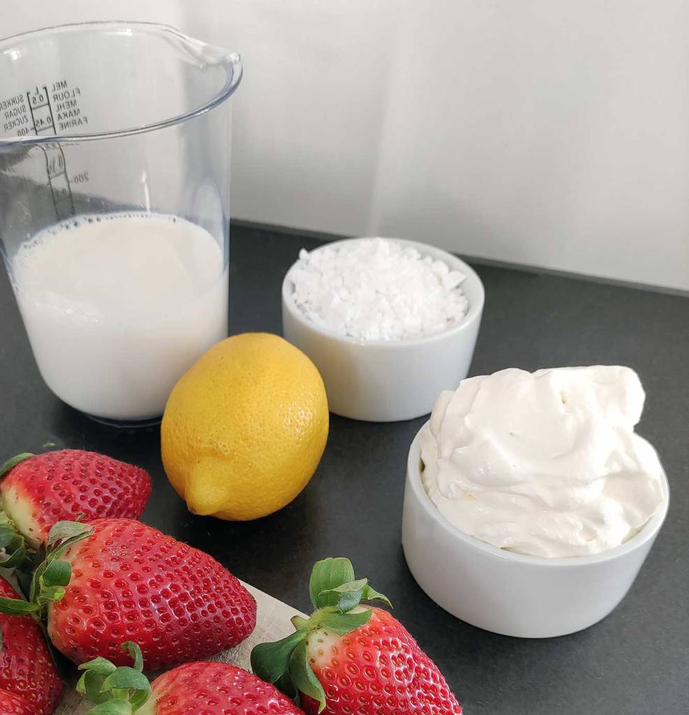 Zuerst werden die Erdbeeren gewaschen, von Blättern befreit und in kleine Würfel geschnitten. Dann wird der Puderzucker dazu gesiebt. Die Masse wird anschließend püriert, beispielsweise mit einem Stabmixer. Danach kommt die Milch und der Zitronensaft dazu. Zum Schluss wird die Sahne steif geschlagen und mit dazu gegeben. Alles gut miteinander verrühren.