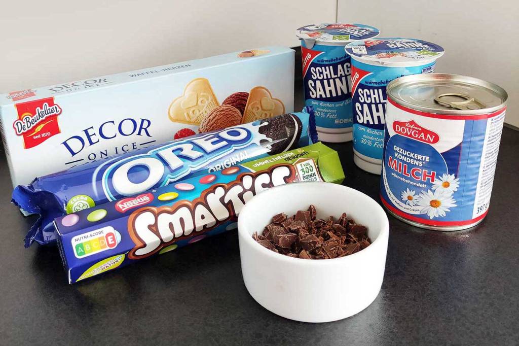 - 40 g dunkle geraspelte Schokolade(*) (Kekse, Smarties)