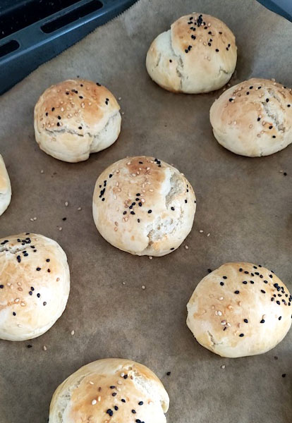 Den Backofen auf 200 Grad Ober und Unterhitze (Umluft: 180 Grad) vorheizen. Den Teig gut durchkneten und in 12 kleine Kugeln aufteilen. Die Kugeln mit Abstand auf ein mit Backpapier belegtes Backblech legen. Nochmals zugedeckt 30 min. ruhen lassen. Ei mit Milch verquirlen, Brötchen damit bestreichen und mit Sesam bestreuen. Ungefähr 20 min. backen.
