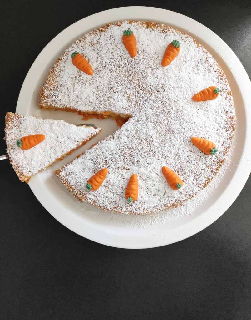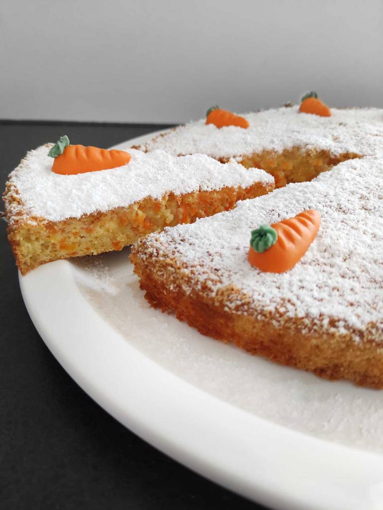 Möhren schälen, waschen und fein raspeln. Den Zitronensaft dazumischen. Das Eiweiß und Eigelb der Eier trennen. Die Eigelbe mit Zucker und Wasser mischen und verrühren. Das Zimt, das Nelkenpulver und die Zitronenschale dazugeben. Die Möhren, die Mandeln und das mit Backpulver vermischtes Mehl darunter mischen.