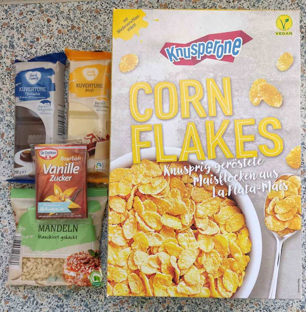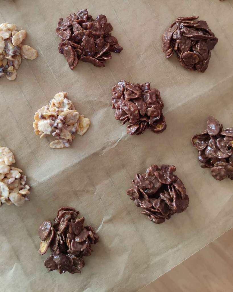 Die Schokolade schmelzen und mit den Cornflakes mischen. Mit zwei Löffeln Choco Crossies formen und diese auf einem Backpapier trocknen lassen.